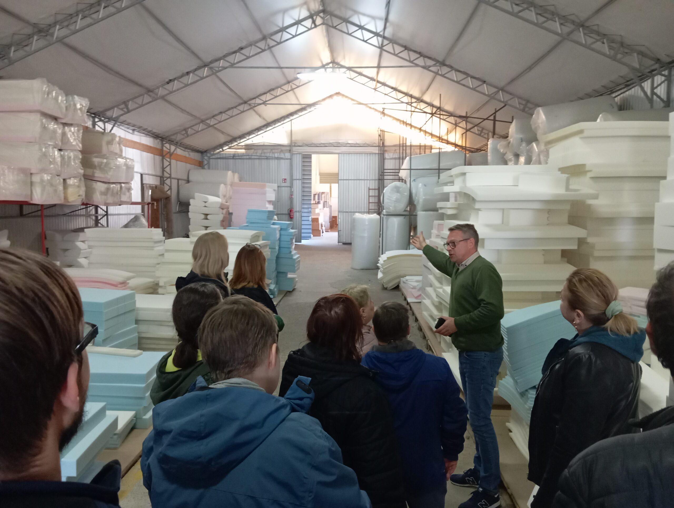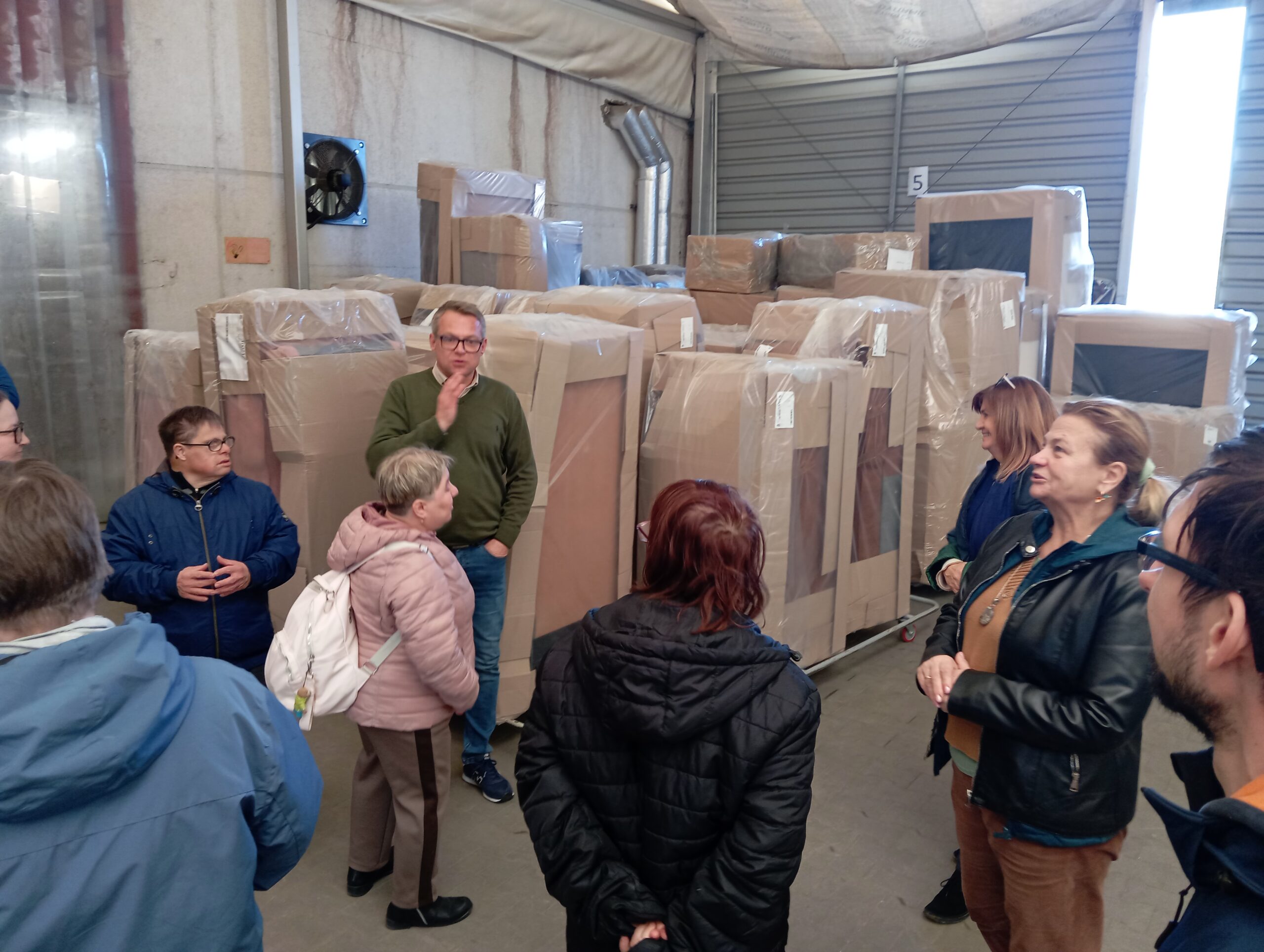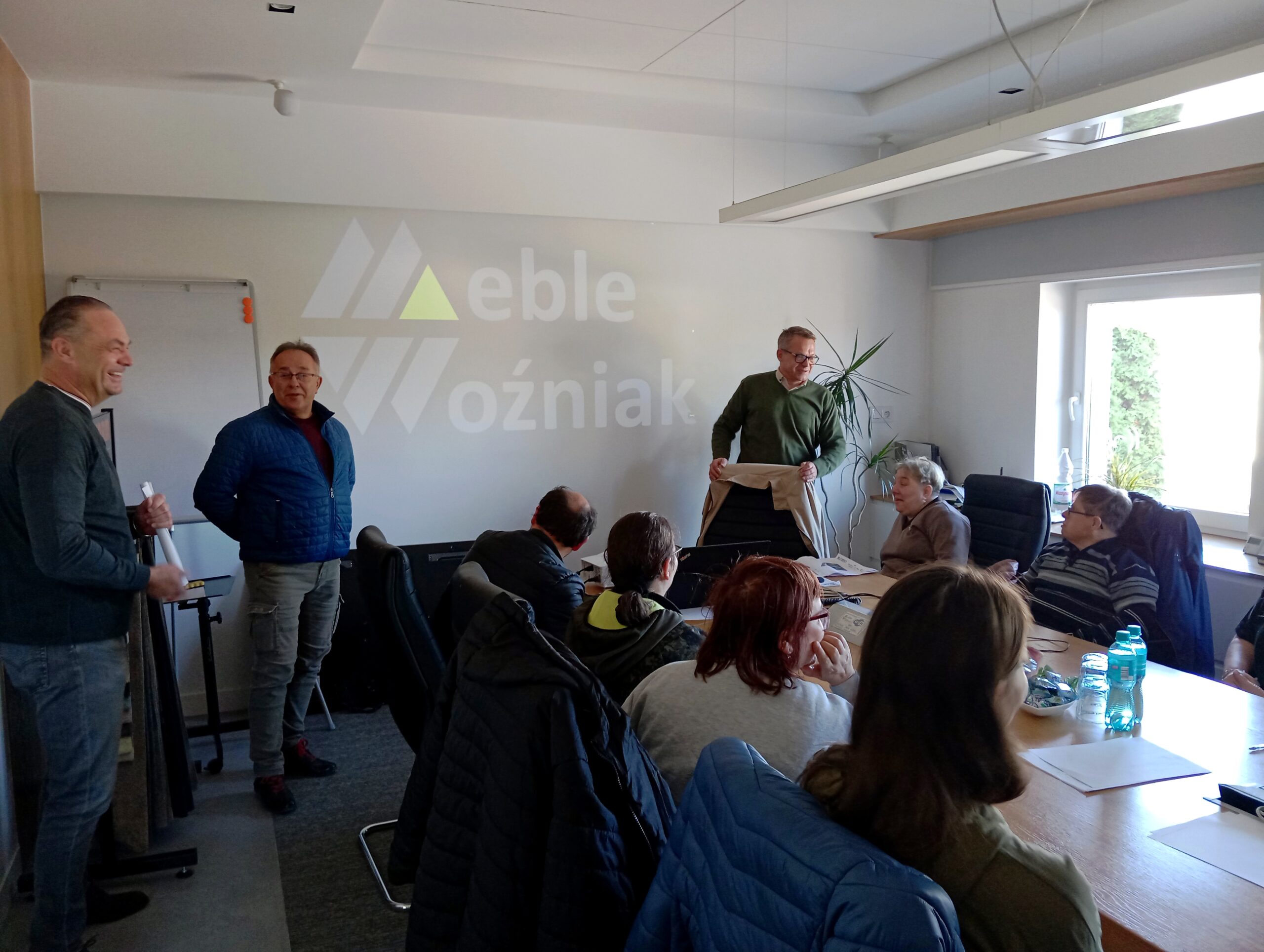 Druga grupa odwiedziła firmę Meble Woźniak (ul. D. Chłapowskiego 35, Ostrów Wielkopolski), gdzie uczestnicy mogli przekonać się, jak wygląda proces tworzenia mebli – od pomysłu i projektu, przez dobór materiałów, aż po montaż gotowych elementów. Po zakładzie oprowadzał nas Pan Sławomir Piekielny, który z pasją i zaangażowaniem opowiadał o swojej pracy. Uczestnicy z zainteresowaniem obserwowali działania fachowców. To spotkanie w firmie Meble Woźniak było dla wszystkich wyjątkową lekcją rzemiosła – pełną inspiracji i wiedzy. ![]()